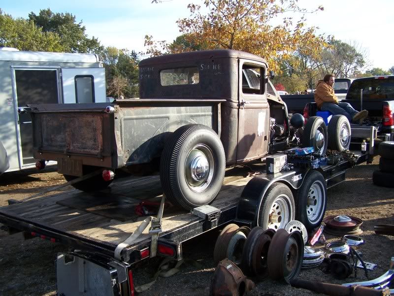 We cruised into the Swap with an empty pickup--and then proceded to fill it.  Well, actually Kieth did most of the filling.  I didn't scarf up my usual quota of goodies, but had a good time anyway.  I missed Boardman, but Gary talked to him.  My big boo boo this year was not buying the pair of Briz ribbed aluminum bumpers for $40.00 each.  I could have tripled my money or better right there at the meet.  There were about 200 snow blowers and 250 mini bikes---I did resist for another year. Oh yeah, I resisted a lifesize talking manican dressed in a tuxedo for $200.00  (He kind of looked like Boardman --with hair.) A few nice model A bodies there.  29 RPU for $2750.00  top bows for $365.00.  A couple A sedans in the $500.00 to $750.00 area.